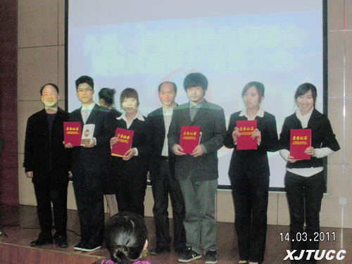 一段关于2010学年学生活动回顾的精彩视频拉开了本次活动的帷幕。大会首先对在2010—2011学年中在学习、工作等方面表现优异的同学进行了表彰:种莹等5名同学荣获“学生活动突出贡献奖”;兰海英等15名同学荣获“优秀学生奖”;外语系学生会自律部和文宣部荣获“优秀团体奖”。