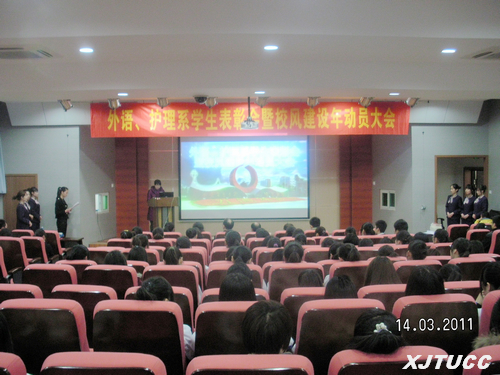 2011年3月14日下午,外语、护理系在F100多功能厅举行了外语、护理系学生表彰会暨校风建设年动员大会。外语系副主任赵永生老师、韩红建老师,护理系主任助理王梅芳老师、秘书李莹老师,外语、护理系学工办所有老师出席了本次会议。