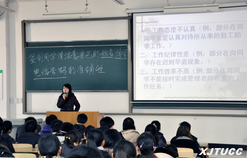 最后,学生资助中心杜艳老师对本学期工作进行了指导。她首先肯定了勤工助学部上学期取得的成绩,特别是在岗位管理与岗位监督方面做出的努力;强调勤工助学部要继续坚持“勤工+助学”、“资助+励志”的发展方向,坚持“自愿申请、信息公开、扶困优先、择优上岗”的原则,按照“资助—自助—助人”的指导思想,帮助和鼓励家庭经济困难的学生积极参与到学院的各项工作当中;希望学院勤工助学部这个平台能为同学们提供更多交流与学习的机会,让大家可以通过锻炼提高认识、磨砺品质,也让同学们能够在轻松快乐的氛围中工作学习,从而度过一个充实而有意义的大学生活。