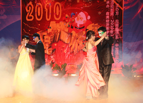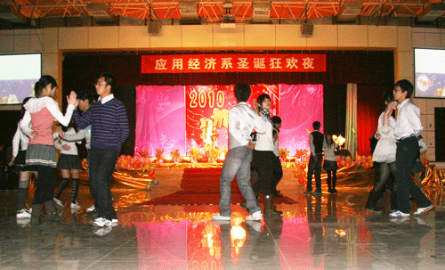 2010年12月23日晚,应用经济系“Gelivable”圣诞狂欢舞会在大学生活动中心激情上演。此次活动由学院应用经济系和中加项目办联合主办、应用经济系学生会承办。应用经济系副主任史冬梅老师、中加项目办张武杰老师、应用经济系学工办全体老师以及各兄弟系学工办的各位老师出席了此次活动。