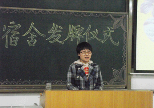 本次活动由学工办负责人职慧老师主持,她谈到,在学生公寓中设立“党员示范宿舍”是进一步贯彻落实党的十七届四中、五中全会精神,落实全国、全省高校党建会议精神,推动党建工作和大学文化建设深入开展的一项重要举措;对带动和服务广大同学、引导寝室文化建设、创建公共卫生环境、促进学生自律与他律等方面都起到良好的积极作用。此外,她还提出了几点要求:一要进一步推进学院学生党建进公寓工作,充分发挥学生党员的模范带头作用。二要严格标准,切实加强对学生党员示范宿舍的检查和管理。三要坚持常抓不懈,实现“学生党员示范宿舍”的制度化和规范化。