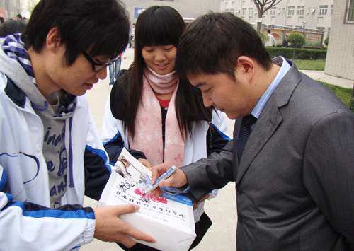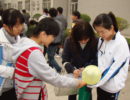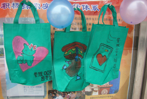 他们以世园会的“绿色引领时尚”为主题,设计出一个个别出心裁、个性十足的环保袋,并用各自精心制作的环保袋与仍在使用塑料袋的老师、同学进行交换,呼吁大家要重复使用环保袋,减少白色污染。