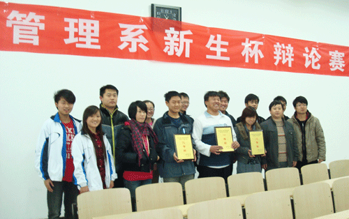 群雄舌战展雄风,争锋相对辩天下。2010年11月15日,管理系新生辩论赛决赛在F200顺利举行。机械系团工委书记辛红伟老师、电信系团工委书记李静老师、艺术系李成老师、管理系团工委书记曹嘉伟老师、院辩论协会以及管理系部分班级出席了本次比赛。奕术辩论协会会长曹轶�同学、辩论协会资深辩手惠敏同学及管理系学生会主席周菁同学担任此次比赛的评委。