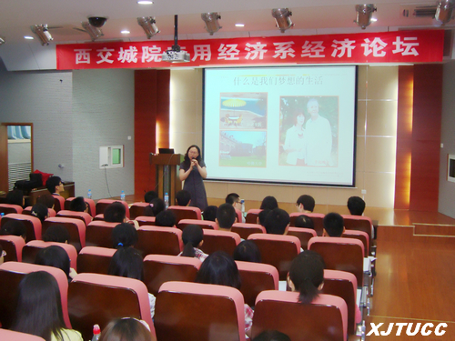 4月27日晚,应用经济系第七期经济论坛在学院F100报告厅举办。受应用经济系邀请,国家理财规划师、东方华尔高级研究员朱晓炎女士作客经济论坛,做了题为“财富让人生更美好”的专题报告。北京东方华尔西安分公司经理许艺馨先生、高校部主管管昊宇先生、课程顾问韩姣姣女士,应用经济系系副主任史冬梅老师和系08级学生出席论坛。此次论坛由系学工办负责人陈涛老师主持。