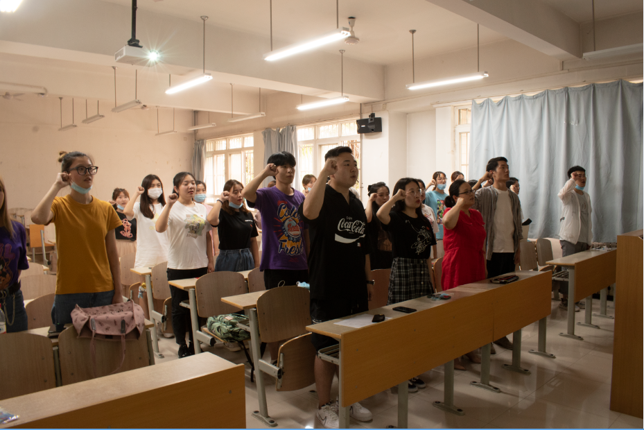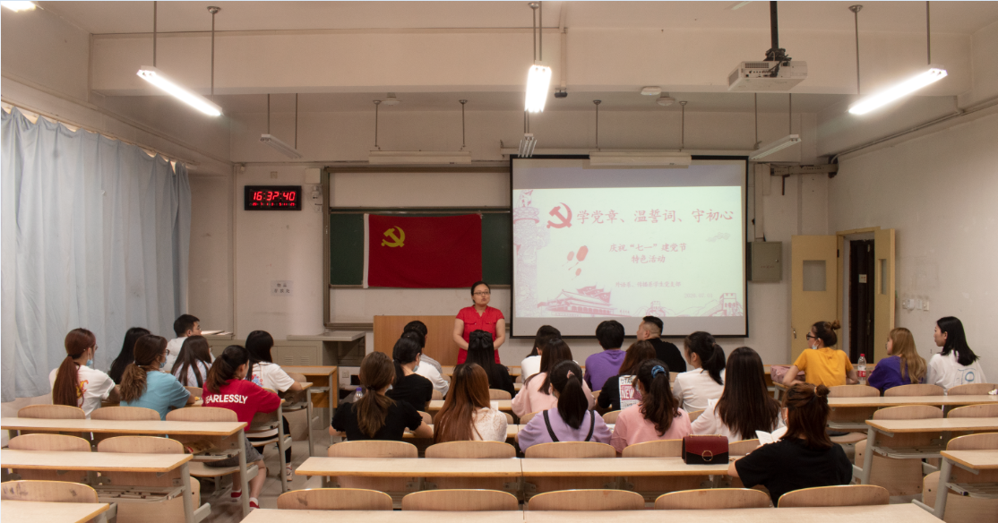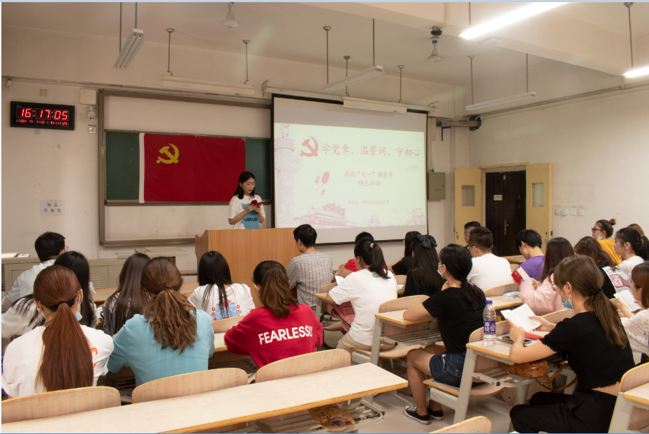 为了纪念中国共产党建党99周年,威尼斯7798cc外语系、传播系学生党支部于7月1日下午16点在教学楼D107开展了主题为“学党章、温誓词、守初心”的“七·一”建党节特色活动。本次活动由党支部书记张天主持,组织委员杨耀聪、宣传委员刘牧原以及党支部全体党员共同参与。