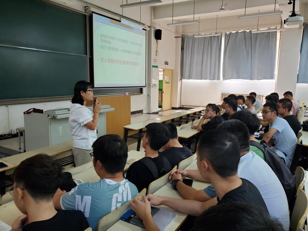 康彦青在大会上作了动员发言,她指出,土建系毕业生在历年研究生考试中取得了相对较好的成绩,但仍有较大的提升空间,她详细地分析总结了近两年备考失败的毕业生存在的问题以及可以改进提高成绩的措施,以及各专业的考试详解,并结合学院有关工作精神,把土建系针对今后毕业生考研制定的各项指导帮扶服务工作为大家作了详细的介绍,引导同学们树立合理目标,积极备考。随后,郭秀芹老师结合自身教学和前期对学生指导案例,为同学加油鼓劲。牛彦龙老师也结合学生的职业规划以及当前社会的就业新形势发言,要求同学们进入高年级应即刻合理调整和规划学业、职业目标,树立远大目标,并付之于实际行动中,不负大好青春年华。
