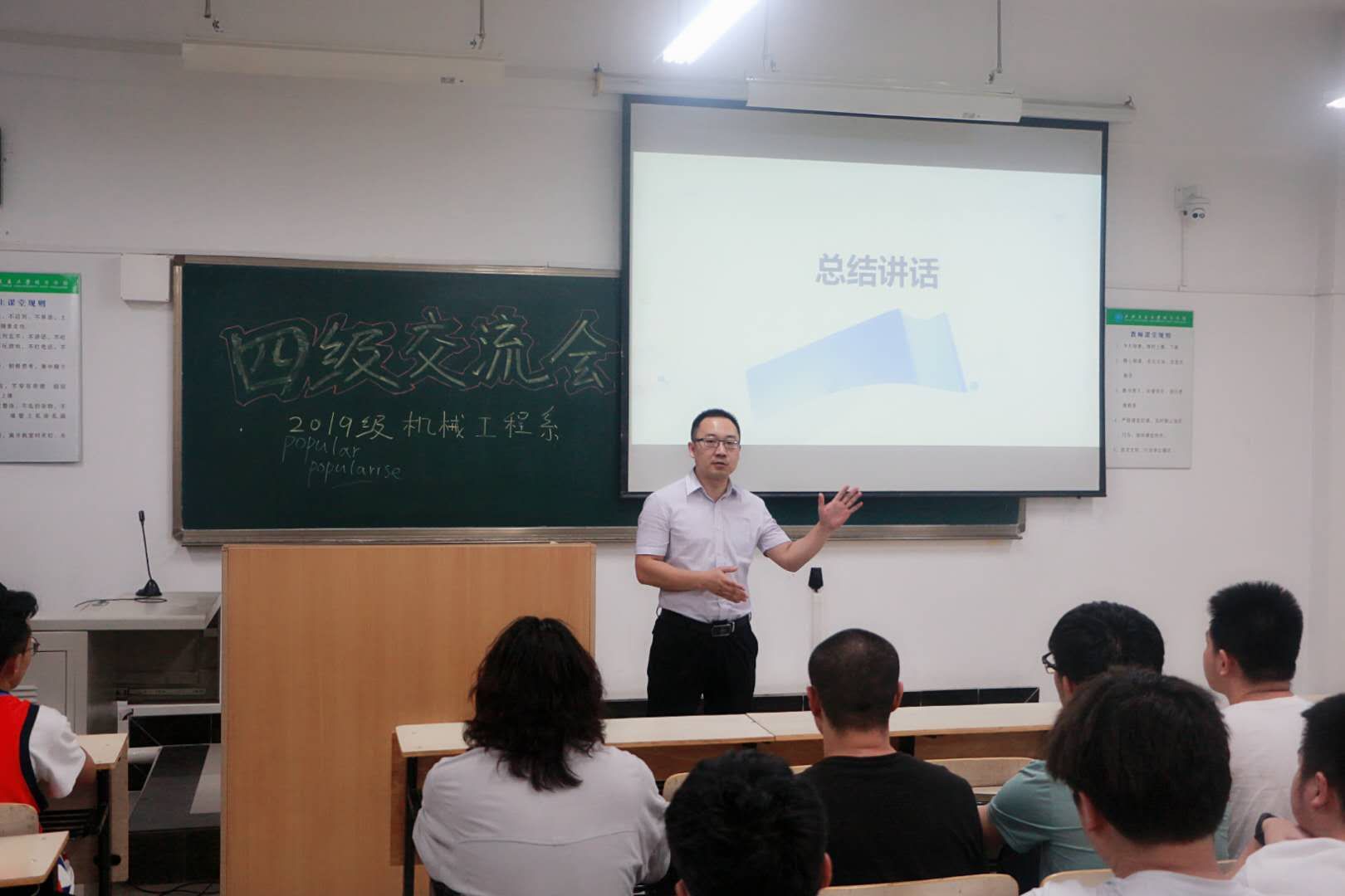 最后,霍伟森进行总结动员。霍老师从毕业、就业等学生未来发展角度,深入分析通过四级的必要性;同时他强调,全体学生要有坚决的学习态度,按照备考计划按部就班,认真备考,希望每一位学生“全力备考,每分必争,尽力考出自己最好水平”,并预祝所有学生在四级考试中取得优异的成绩。