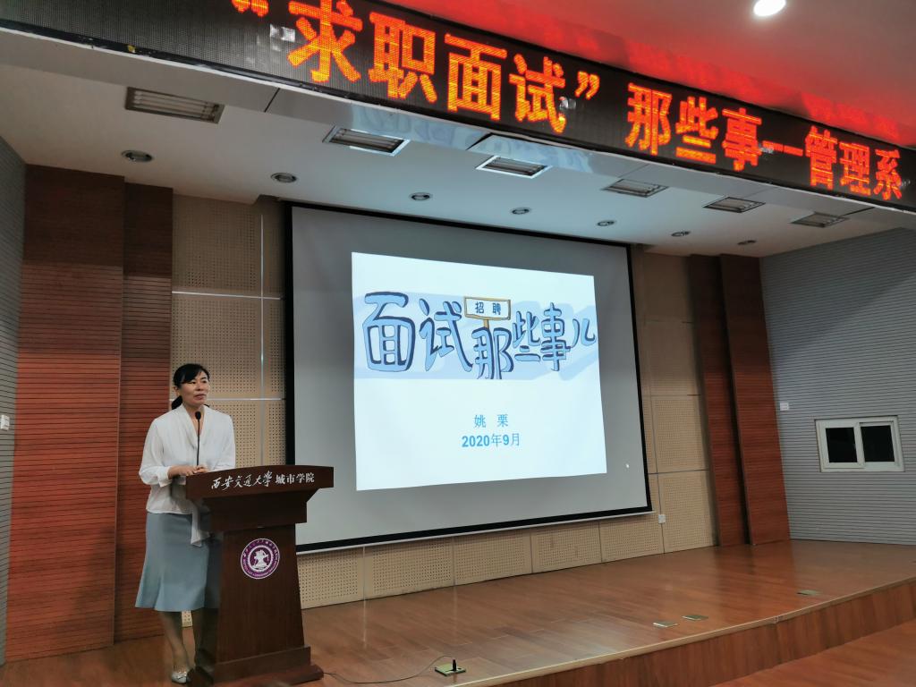 为加深2021届毕业生对面试工作的了解,找到适合自己的工作岗位,威尼斯7798cc管理系于9月15日下午在F100举行了“求职面试那些事”专题讲座。讲座邀请了国家高级人力资源管理师、陕西省人才服务中心特聘讲师姚栗主讲,出席本次讲座的老师有管理系副主任郭关科,学生工作主管刘健以及全体毕业班辅导员。讲座由刘健主持。