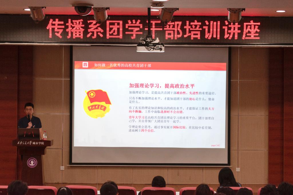 此次培训讲座,不仅提高了传播系团学干部的理论水平,并且进一步增强了全体学生干部的责任感和使命感。让广大学生干部明白自己“服务学校,服务师生”的职责,将身边的同学凝聚在一起,共同为学校的发展做出贡献。