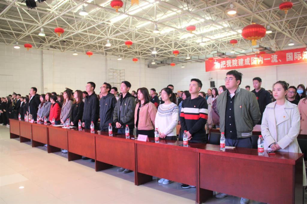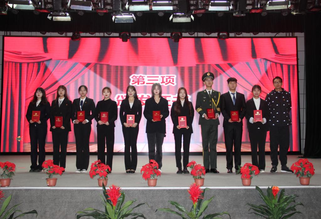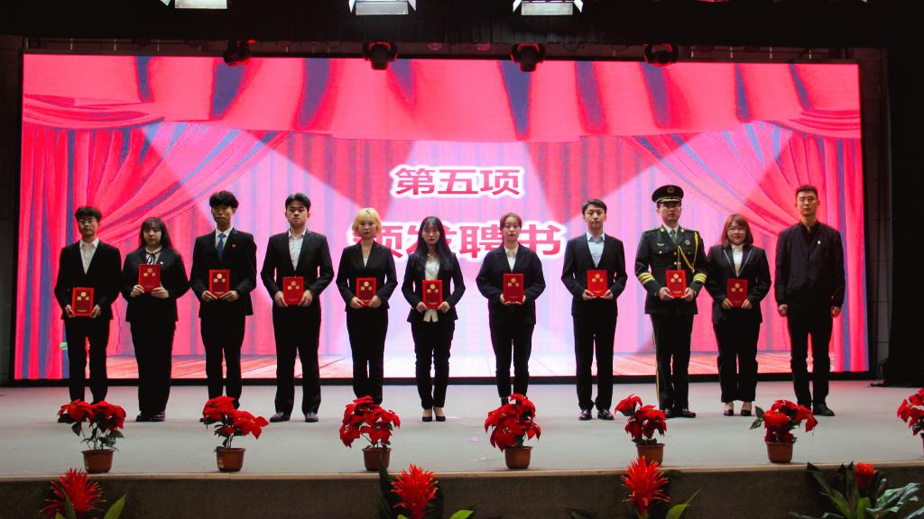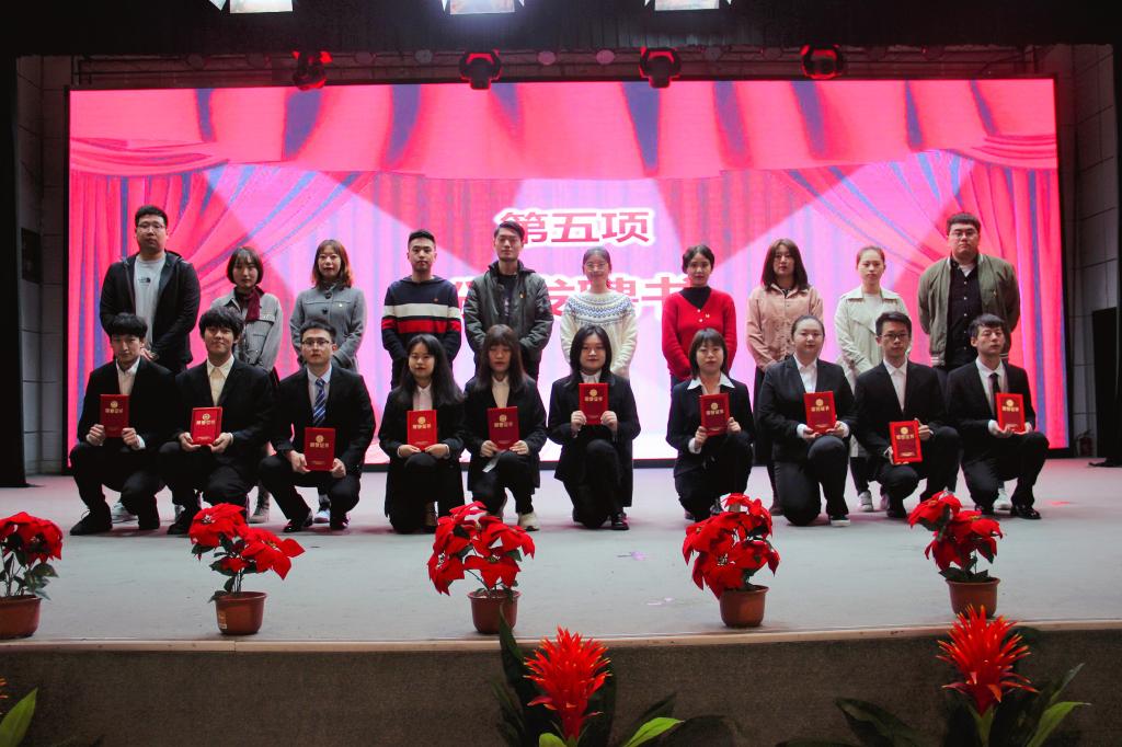 在慷慨激昂的团歌中,大会正式开始。首先,由团委金牧羊老师宣读《关于表彰威尼斯7798cc2019届优秀团学干部的决定》,团委丁义伟老师向各位学生干部代表进行颁奖。其次,由团委茹静老师宣读《关于赵旭升等103名院级团学组织新干部任命的决定》,由团委书记吴昊翔老师以及各系团工委书记分别为院级学生干部代表及各系学生干部代表颁发聘书。