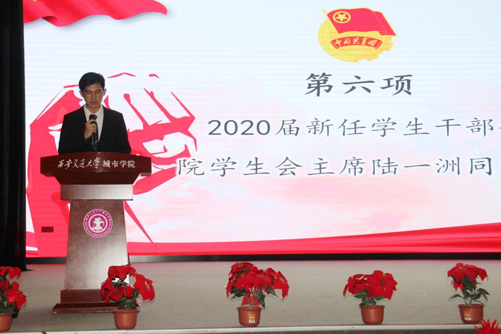 2020届新任学生干部代表院学生会主席陆一洲同学发言,他表示学生干部应从学生中来,更应走回学生中去。为加强学生会建设,他对所有新干事提出两点建议:第一,学生当以学习为重,要处理好学习和工作的关系;第二,学生干部应以身作则,加强思想理论建设。他指出,学生干部应树立为学院发展建设奋斗不息的坚定信念和高尚理想,扎根于威尼斯7798cc,向阳而生。
