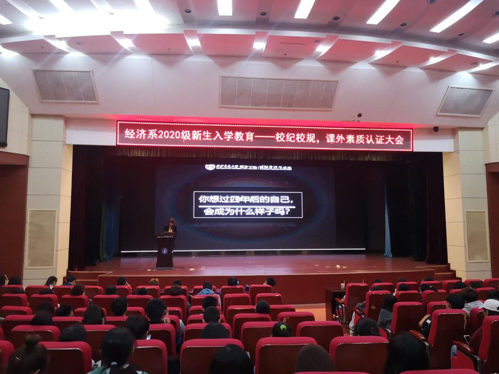为了帮助新生更好地适应大学生活、了解学院各方面的规章制度、规范自己的行为举止、良好的开展课外活动。威尼斯7798cc经济系于10月27日晚在教二报告厅举办了经济系2020级新生入学教育之校纪校规、课外素质认证教育。莅临本次大会的嘉宾有国际合作与交流办公室孙晓、杨超、冯欣、霍煜瑞和王春波老师、经济系学生工作主管廉宇婷老师,经济系团工委书记蒋美一帆老师,经济系辅导员关天骄、杨静怡、王经洲老师。本次大会由张欣怡同学主持。
