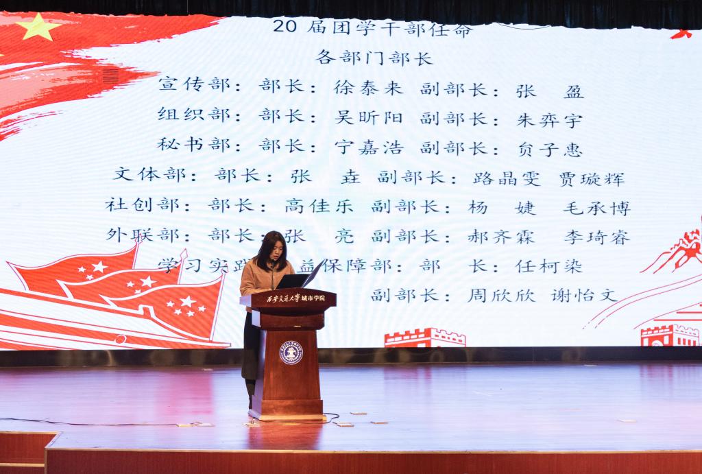 在同学们热烈的掌声中,团工委书记陈欣老师宣读了新一届团学会干部的任命名单并颁发了证书。接下来,新生干部代表赵雪瑶同学进行发言,她向大家表达了自己加入团学会后的感想,同时呼吁大一全体学生干部能够不忘初心,保持这份热情。随后,团工委副书记周昊、团学会主席张渲钰对上一学年的团学工作分别进行了总结汇报。