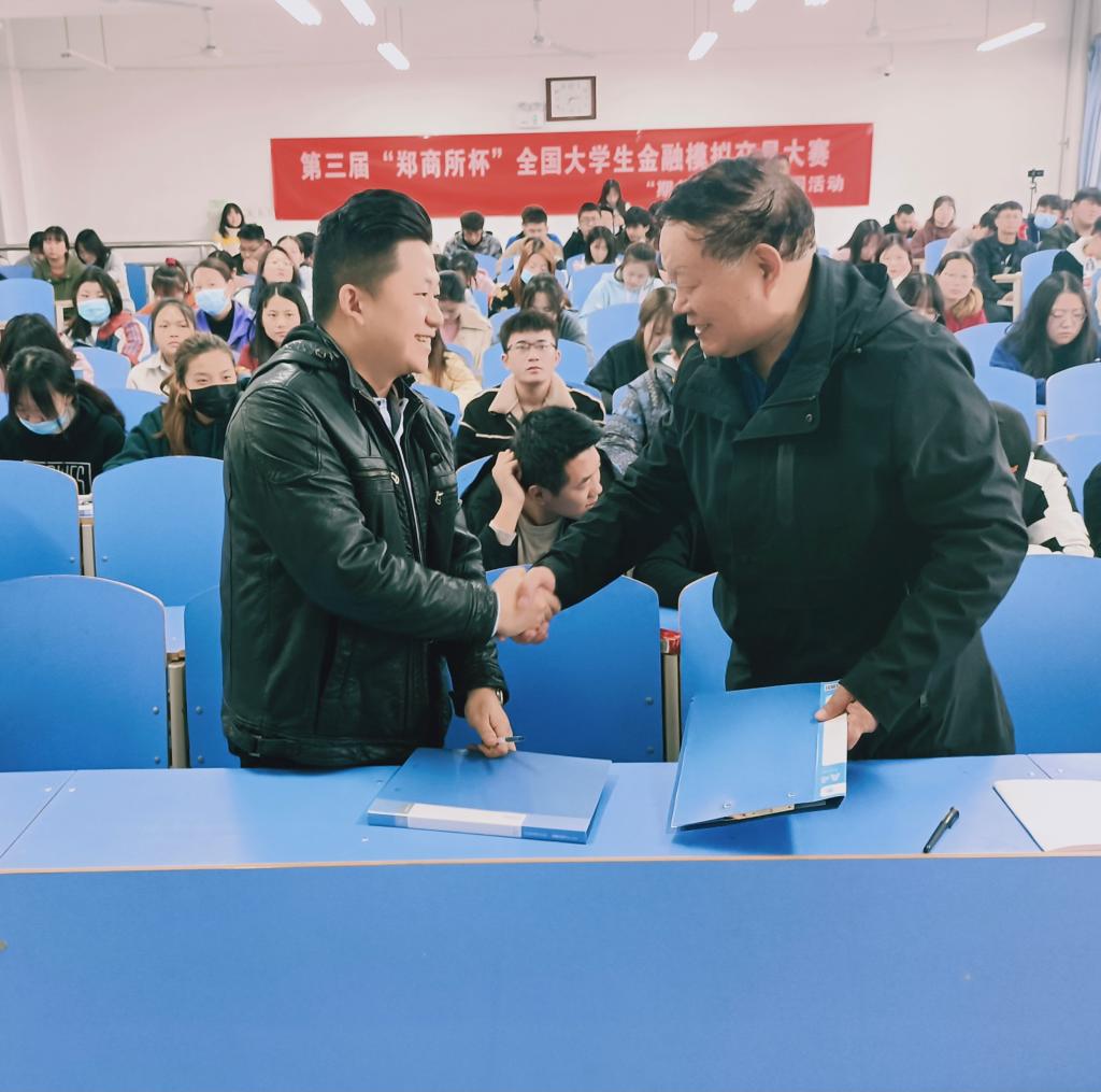 大会伊始,由经济系主任张文科老师致词,他向同学们介绍了期货与“郑商所杯”金融模拟交易大赛,希望同学们在此次大会中可以充实自己、提高自己,积极参加竞赛,赛出水平、赛出风格。随后经济系主任张文科老师与中辉期货公司西安分公司经理马越进行了签约合作仪式。紧接着马越经理为同学们讲述了期货市场现状,他以“铜”举例为同学们讲解了期货交易的规则,使同学们受益颇丰。张友为经理介绍了有关郑州商品交易所的会所概况:组织架构、上市品种以及特有的企业文化等,并向同学们讲解了有关期货交易中,止损止盈的原理、画线下单、套利设置、套利委托等在软件上的具体操作,使同学们对于“郑商所杯”有了更进一步的了解。
