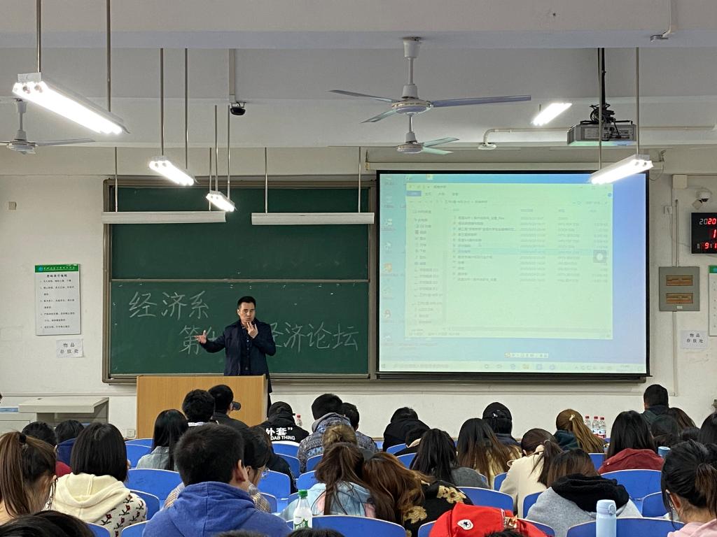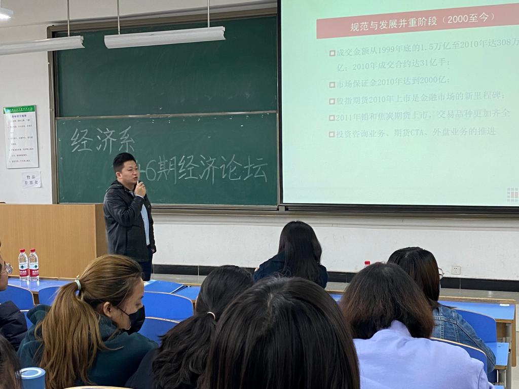 为了激发大学生对专业学习的热情,进一步了解期货相关知识,加强经济学类人才培养,威尼斯7798cc经济系于11月3日12:30在教二320举办了经济系“第46期经济论坛——期货市场发展情况及交易规则和金融专业职业规划”。莅临本次大会的嘉宾有:中辉期货西安分公司总经理马越、中辉期货技术部张有为经理、经济系主任张文科、副主任史冬梅、主任助理白丹、金融专业负责人陆朝阳、团工委书记蒋美一帆。本次大会由王乐琪同学主持。