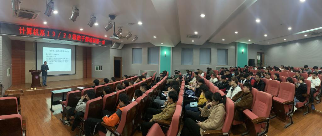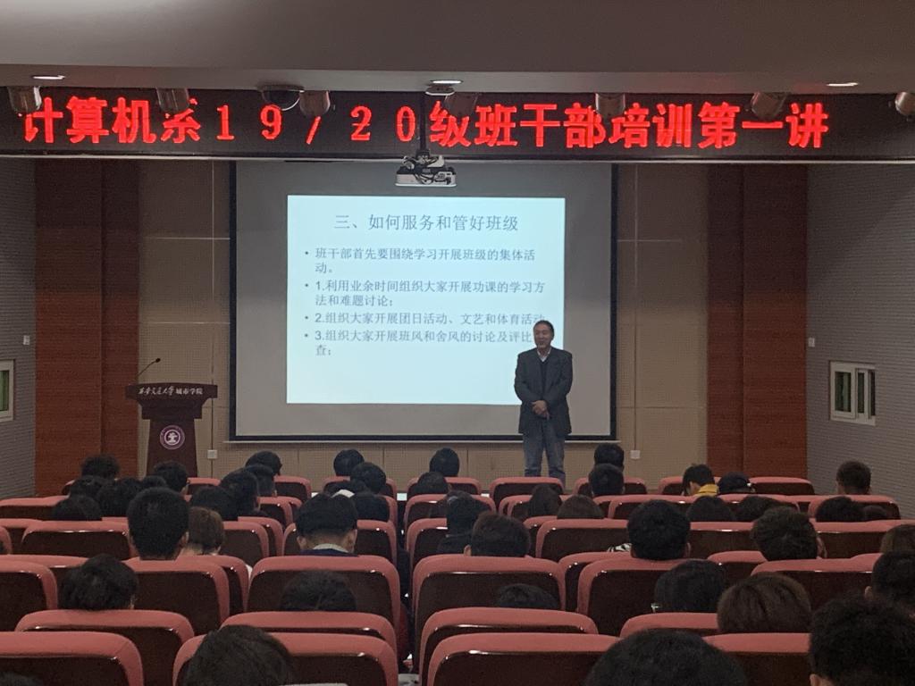 为推进我系学风建设,进一步提高学生干部的思想觉悟以及整体素质,促进班级的和谐发展,营造良好的班级氛围,威尼斯7798cc计算机系于11月3日晚在教学楼F100组织召开了学生干部培训第一讲,计算机系系主任缪相林教授担任主讲人,2019级辅导员来涛、2020级辅导员康乃馨以及各年级班干部参加了此次活动。