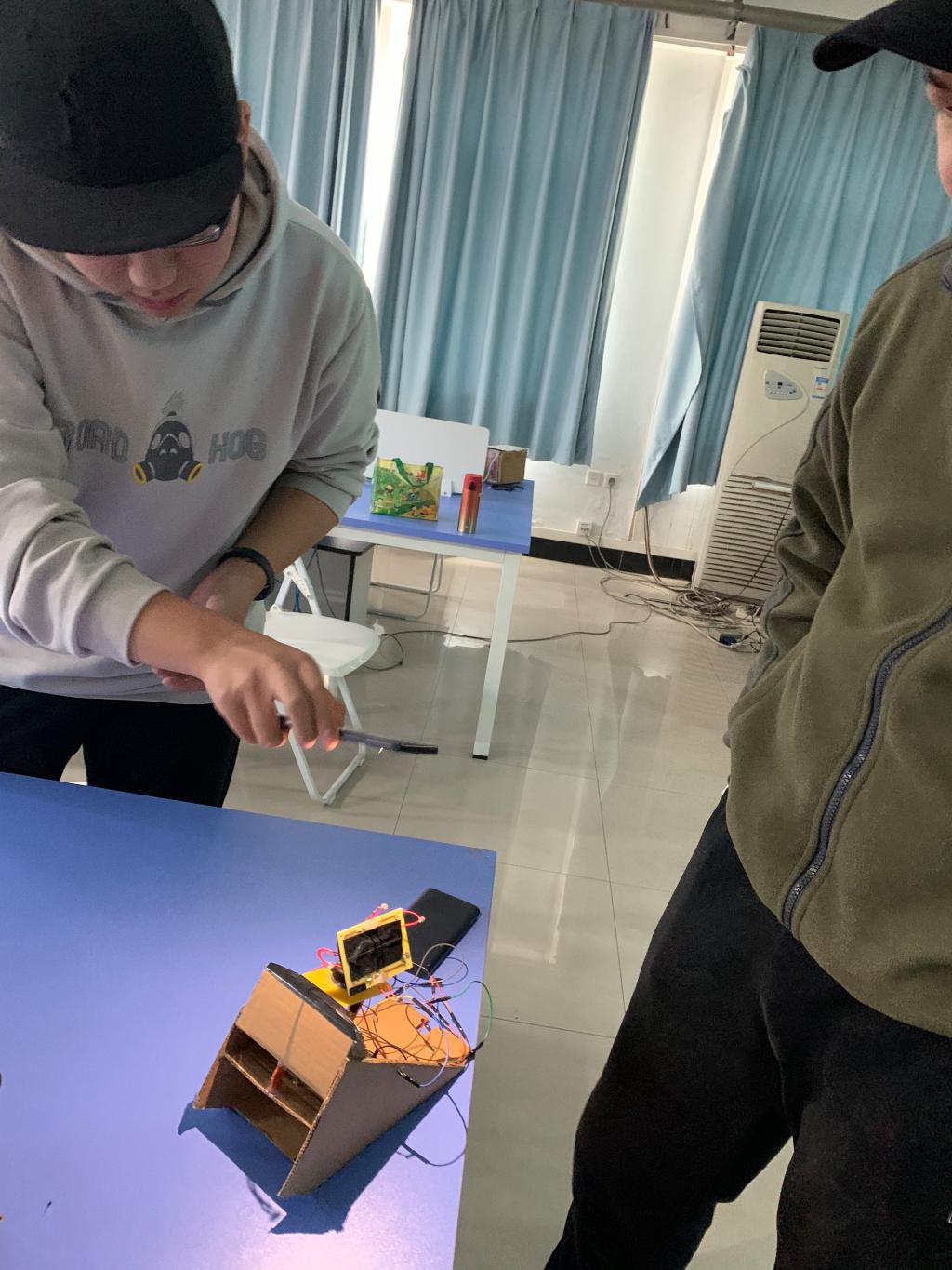会议由电气专业教师张建老师主持。首先,由学生依次讲解作品的制作原理、制作成本及演示作品的功能,然后对各位老师的提问进行解答,最后,各位老师给出改进的意见及建议。很多作品受到了参会老师的高度赞赏。