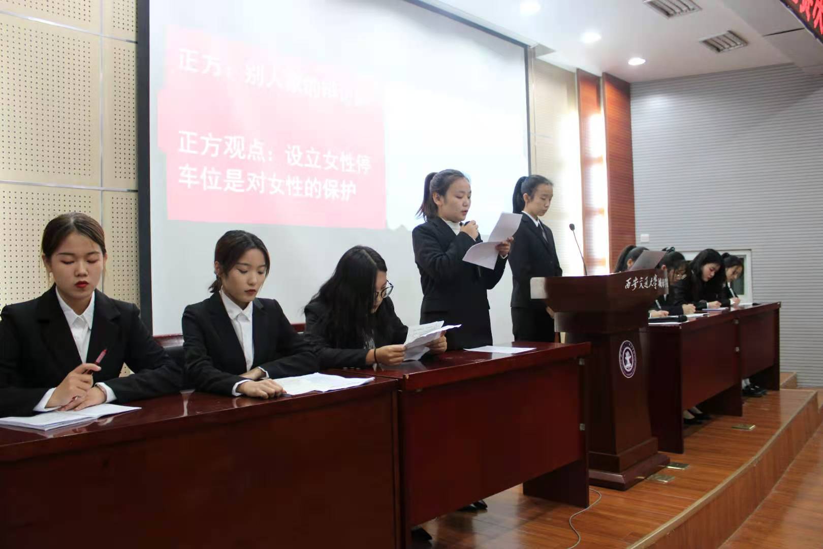 经过初赛、半决赛的比拼,最终来自会计201班的“别人家的辩论队”队和会计203班的“达拉崩吧斑得贝迪卜多比鲁翁”队成功晋级了决赛。决赛双方以“设立女性停车位是对女性的保护还是歧视”展开辩论。比赛正式开始,双方选手在上台之后进行了一段简短的自我介绍,随后在主持人的指引下入席。刚一开场,场上的氛围便紧张了起来。正方率先引出自己的观点,为接下来辩论赛的进行创造了一个良好的开端。在正方的进攻下,反方也不甘示弱。在自己辩题的基础上反问正方,并且针对“女性停车位”这一标题提出了质疑。在随后的质询、对辨和盘问环节,双方队员都根据自己的理解以及客观真实的事例来维护自己的观点,反驳对方,并引出接下来的话题。在经过了双方四辩陈词环节之后,双方队员停止辩论,回到观众席就坐。