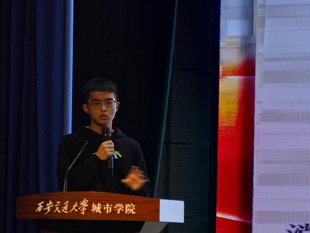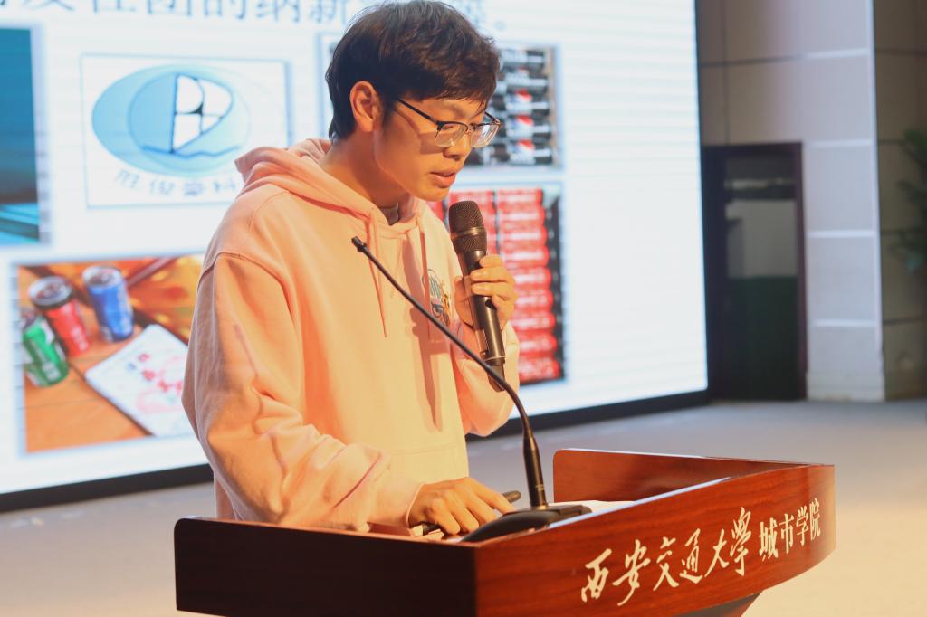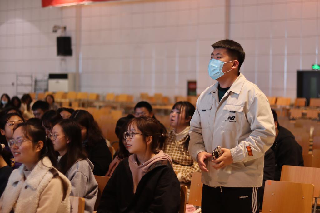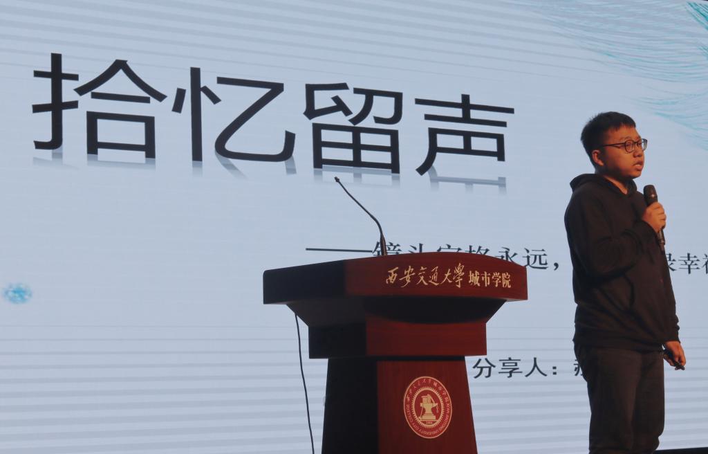 其次,由毕业生郝旭锋讲述他的大学经历以及在大学期间创立的拾忆留声工作室。介绍了其工作室主要从事业务为拍照摄影、录音和平面设计。他强调“镜头定格永远,声音记录幸福”,希望能为大家留住大学里的每一份美好记忆,同时鼓励同学们不负韶华,积极参与到创新创业项目中,从而提升自己的综合实践能力。