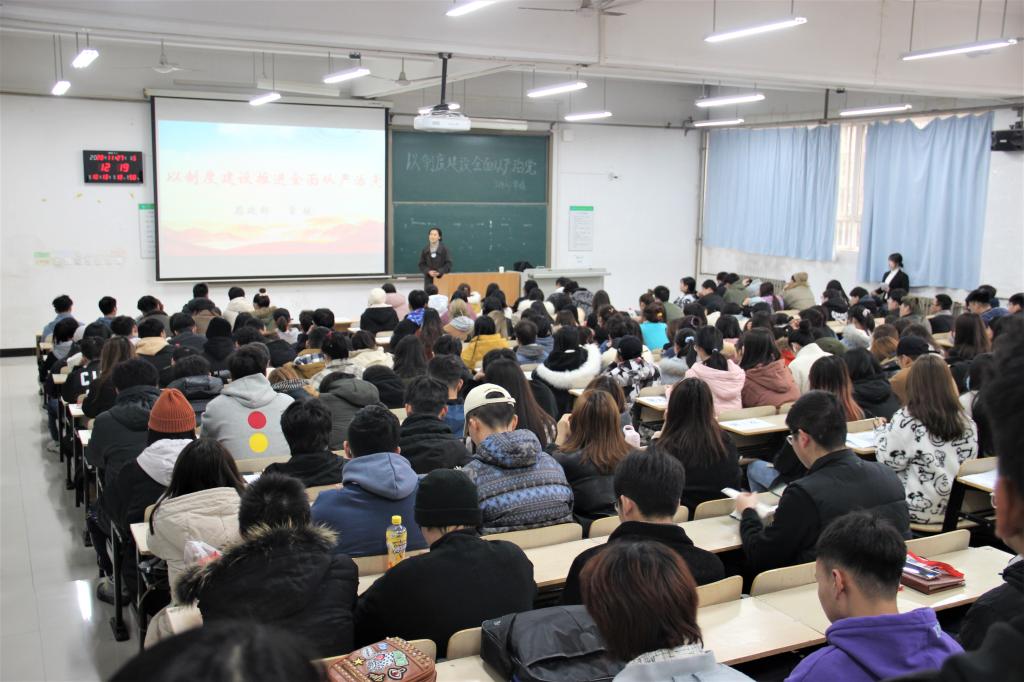 为进一步引导大学生骨干坚定的政治纪律和政治规则,加强对学生干部的培养,我院团委于11月28日中午在教学楼E100开展了“以制度建设推进全面从严治党”为主题的“青马工程”培训班第二讲,本次主讲人为学院思政教学部常媛,由庞丝丹同学主持。