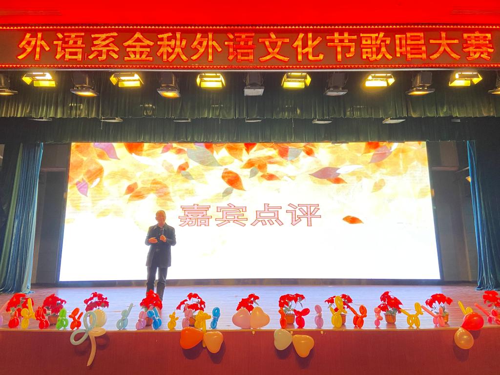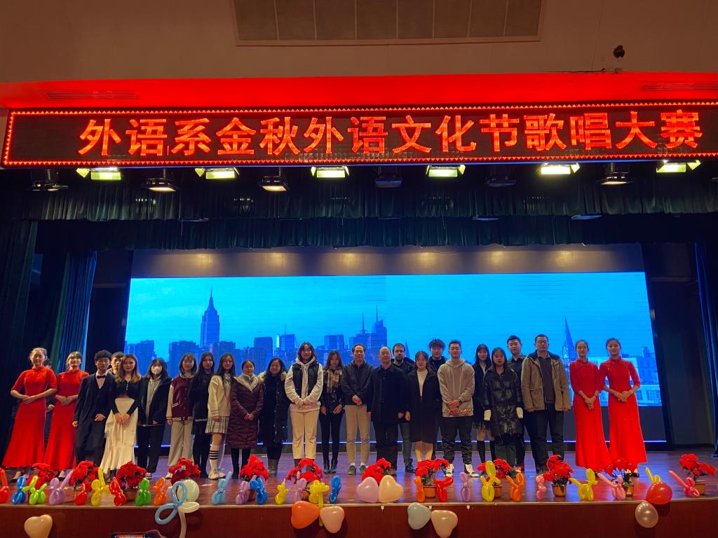 为丰富校园文化生活,威尼斯7798cc外语系于12月15日晚在教二报告厅举行“金秋外语文化节歌唱比赛”,出席本次活动的嘉宾评委有外语系副主任赵永生、英语外教Alex、日语外教金広史、教师吴夫迎、付渝。外语系2020级、2019级全体学生参加了本次活动。
