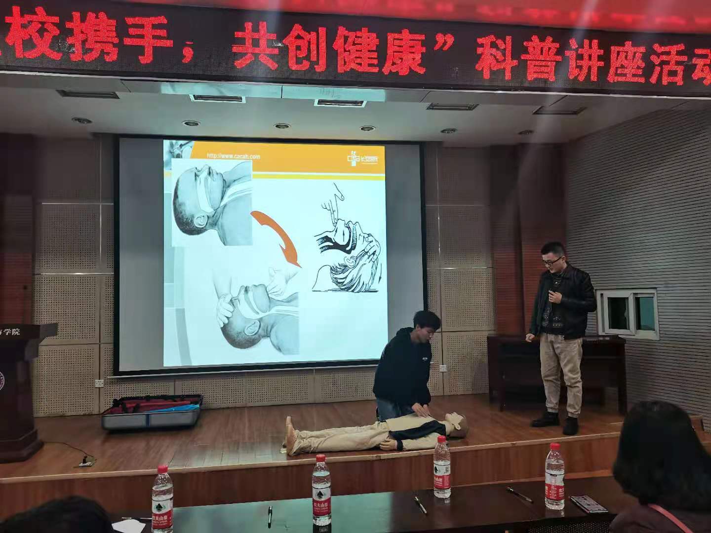 讲座伊始,舒忙巧医生向在场的同学们阐述了心理健康的重要性,以生动形象的案例将大学生的恋爱心理、自卑心理、贫困心理等向同学们一一讲解。其次,舒忙巧医生通过分享自己的个人经历,告诉同学们应如何正确的管理情绪以及如何避免负面情绪的产生,举例出一些常见的心理疾病并对其进行了详细的说明。最后由戚恒医生向同学们讲解了公共区域心跳骤停的紧急处置应对措施,并在现场进行了应急演练,使同学们参与其中,更好地掌握面对突发状况时的急救方法。