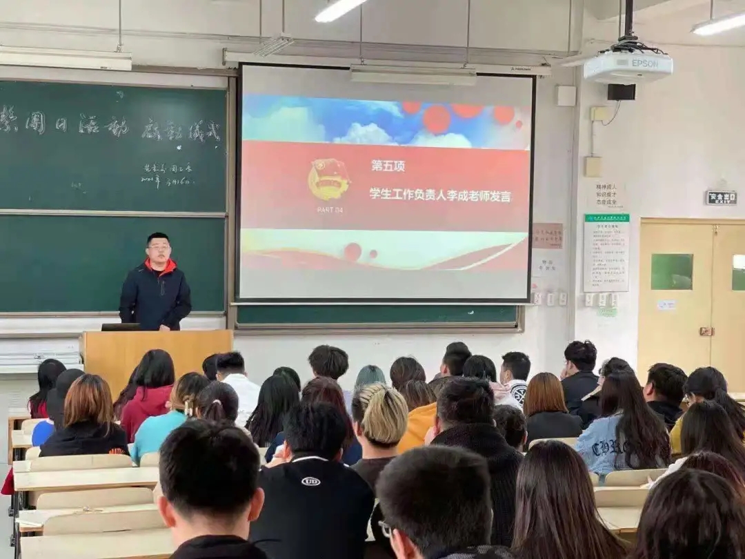大会尾声,学生工作负责人李成总结发言,他希望各团支部认真组织开展此次活动,作为当代大学生,应以昂扬的姿态为全面建设社会主义现代化国家奉献自己的力量,增强“四个意识”,坚定“四个自信”,做好“两个维护”,以学习武装头脑,以宣讲凝聚共识,以活动深化理解,以落实检验成效,充分体会团日活动的目的与含义,在共产党成立百年之际,为祖国献礼。