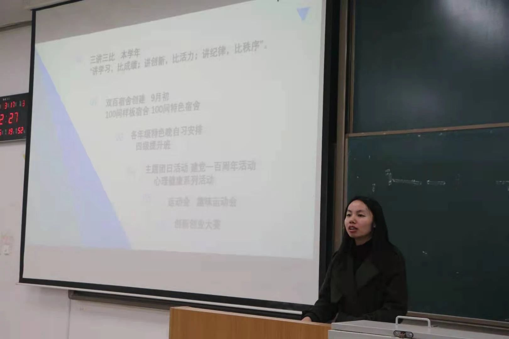 会议伊始,崔佳楠对本学年三讲三比:“讲学习,比成绩; 讲创新,比活力;讲纪律,比秩序”进行详细解释,鼓励学生认真学习,积极参与创新创业大赛,注意考勤和宿舍卫生,并提出将在三月底—九月初进行双百宿舍创建,评比选出10间样板宿舍和10间特色宿舍,殷切希望同学们能时刻保持良好的宿舍卫生。