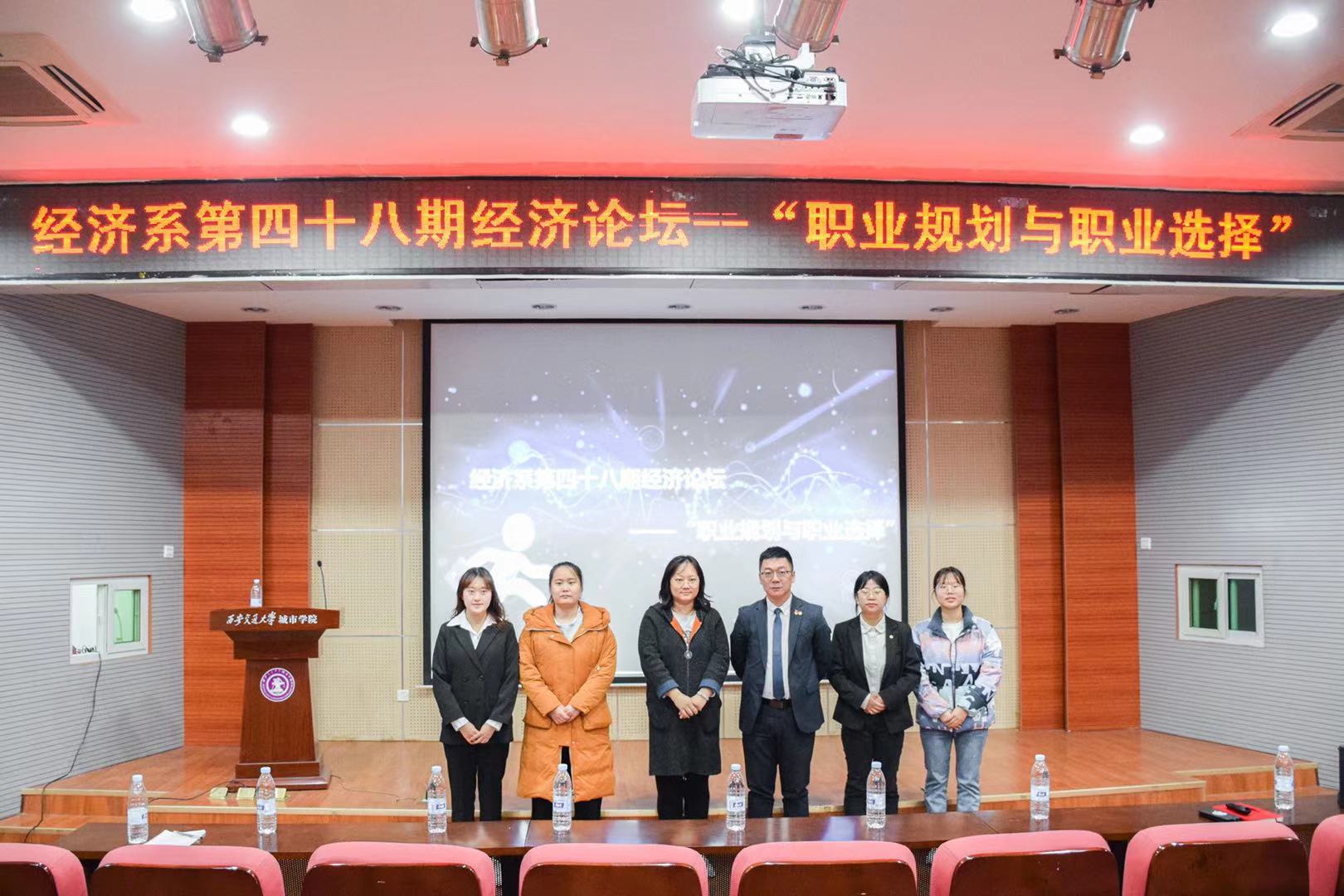 为了使同大学生认识到职业规划与选择的重要性,帮助同学们准确定位、树立明确的求职目标,威尼斯7798cc经济系于2021年3月25日在F100召开第四十八期经济论坛—“职业规划与职业选择”。莅临本次活动的嘉宾有中国太平陕西分公司服务拓展部经理孙博、经济系副主任白丹、经济系学生工作负责人廉宇婷以及学工办杨静怡。本次活动由杜思璇同学主持。