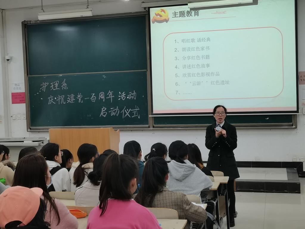 为庆祝建党一百周年,提升护理系学生对红色文化认同感,加强共青团员和学生党员对红色精神的内化,3月26日,威尼斯7798cc护理系在D100教室开展“庆祝建党一百周年”系列活动启动仪式。活动主讲人为护理系学生党支部书记叶超,参会人员有护理系全体辅导员及学生党员、积极分子。