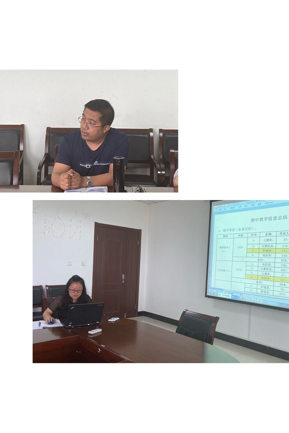 系主任助理门静,分别从机械系各年级学生期中考试成绩、重修、学业预警、英语四级、三证通过率与报名率等问题,进行了详细数据对比和分析。