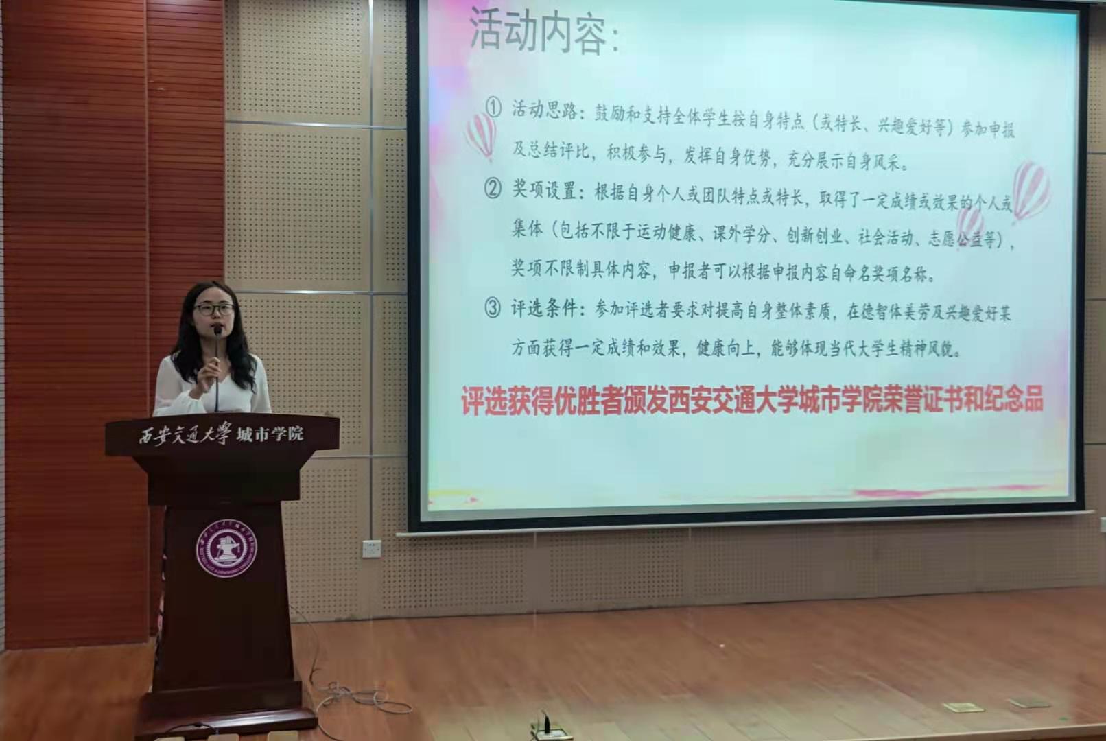 随后,主管王姣也向现场同学们分享了预申报中具有代表性的、特色的个人和集体申报项目,以此来激励同学们积极参与活动。希望各班班委继续做好宣传和切实履行好主体责任,深化对开展本次活动重要性的认识,自觉的、主动的在预报名的基础上再宣传、再动员进一步促进班级人员100%参与。强调本次活动的开展是展示班级良好形象、凝聚班级的重要方式和手段,并对电信系本次活动后续开展情况做出了进一步的工作部署安排。希望通过本次活动可以向学院及各系展示一个全面立体、丰富多彩的电信系。