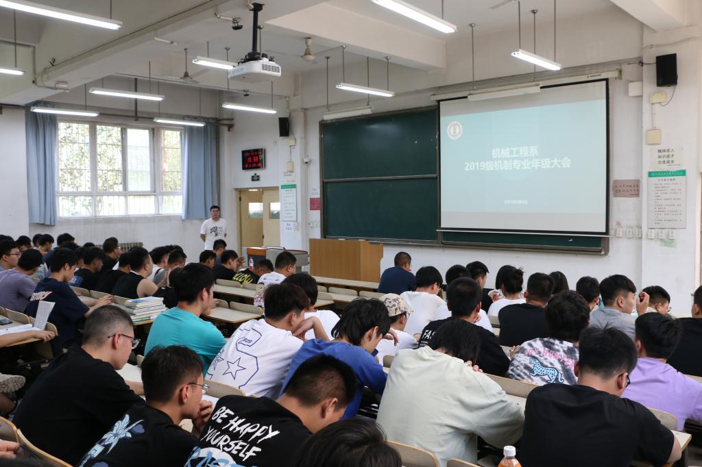 在主持人讲解了召开本次大会的目的与意义后,此次大会正式开始。大会第一项,由机制191班同学陆天晟同学讲述自身学习与生活中总结的一些课上课下的学习经验以及参加竞赛时自己所经历的种种磨炼,最后与同学们交流了自己的考研安排。接下来,机制192班班主任王国平老师以自身带班经历为例,分析了班级上学期期末成绩的提升与学生的成长,与其他老师分享了自己的带班经验与不足之处。大会第三项,吴昊翔老师从学业、考证、学分三方面督促学生在各个年级各个时间段应该做自己该做的事情,同时以18级为例,再次发出对学生的殷切期望。大会最后一项,系主任刘吉轩老师从教室内张贴的学习标语为例,提醒同学们要时刻谨记自己来上大学的目的,将自己的大学生活进行规划,在大学的后两年,确定好自己的努力方向并进行实践,体会家长、老师的良苦用心,来年在毕业时做一个有底气的毕业生。