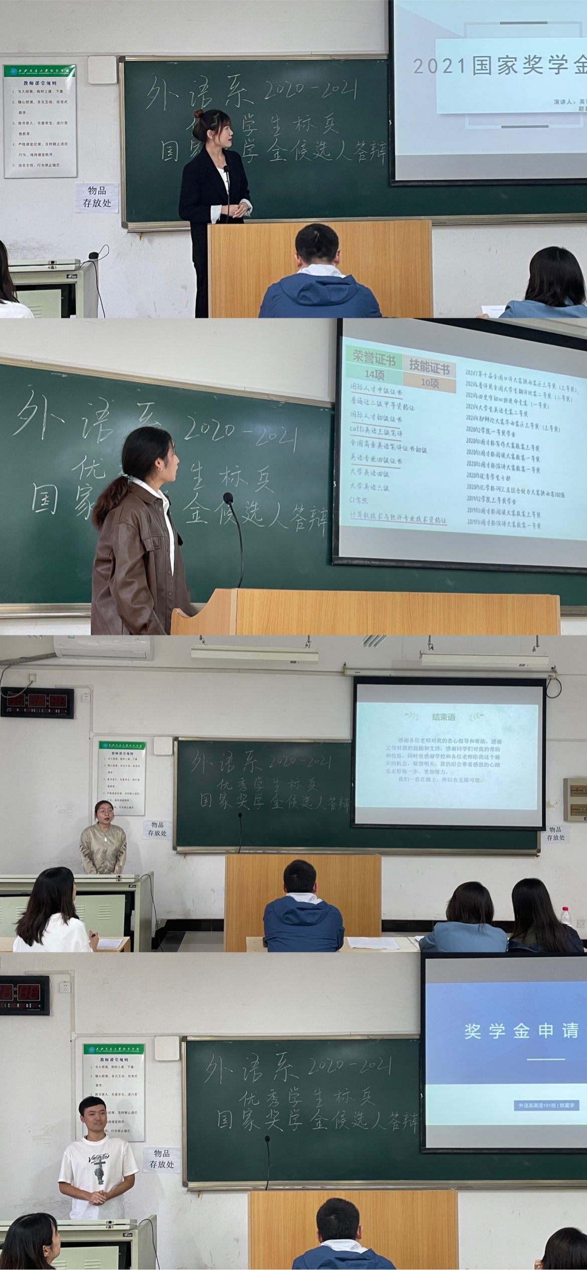 本次外语系优秀学生标兵和国家奖学金答辩会为学生提供了展示自我、公平竞争的舞台,积累了答辩经验,他们纷纷表示后期将坚定信念,勇攀高峰,努力成为全面发展的综合性人才。