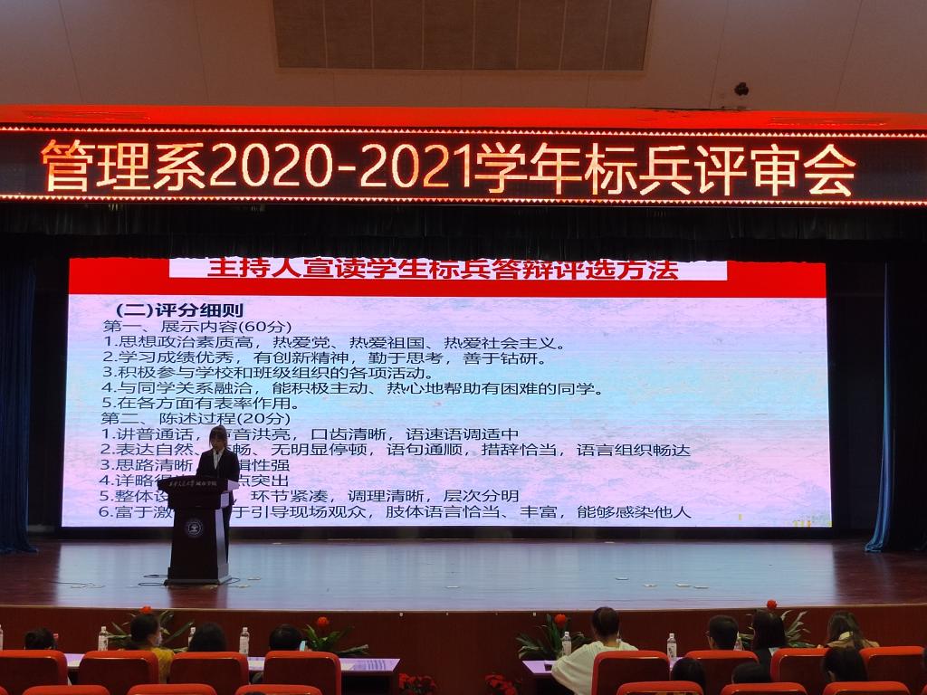 为进一步强化朋辈育人功能,鼓励全系学生向优秀学生学习、像优秀标兵看齐,威尼斯7798cc管理系于9月28日晚在教二报告厅举行了2020-2021学年优秀学生标兵评审展示会。参加此次会议的人员有管理系学工办老师李璐、李辉、乔瑜薇、张德馨、张婷婷、刘连宏、姚赞、柯智航。本次评审展示会由杨玉欣同学主持。
