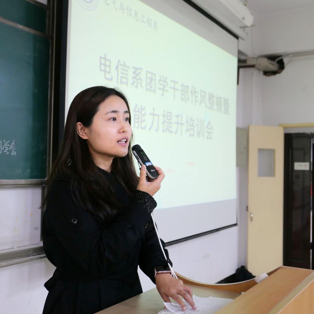 会议第二项,电信系团工委书记徐娟从团学会的学风、作风及干部的能力提升方面提出了四点要求,她希望团学干部们着重加强培养政治意识、纪律意识、服务意识、先锋意识,争做一名讲政治有信念、讲规矩有纪律、讲奉献有作为、讲学习有创新、讲效率有执行的新时代学生干部,重点推荐团学干部多阅读《习近平与大学生朋友们》等有关青年成长、信仰养成的经典书籍。她希望团学干部能够有桥梁纽带观念、有先锋模范意识和服务奉献精神,希望同团学干部共同努力打造一支胸怀理想、心系同学、品学兼优、作风扎实的骨干队伍。