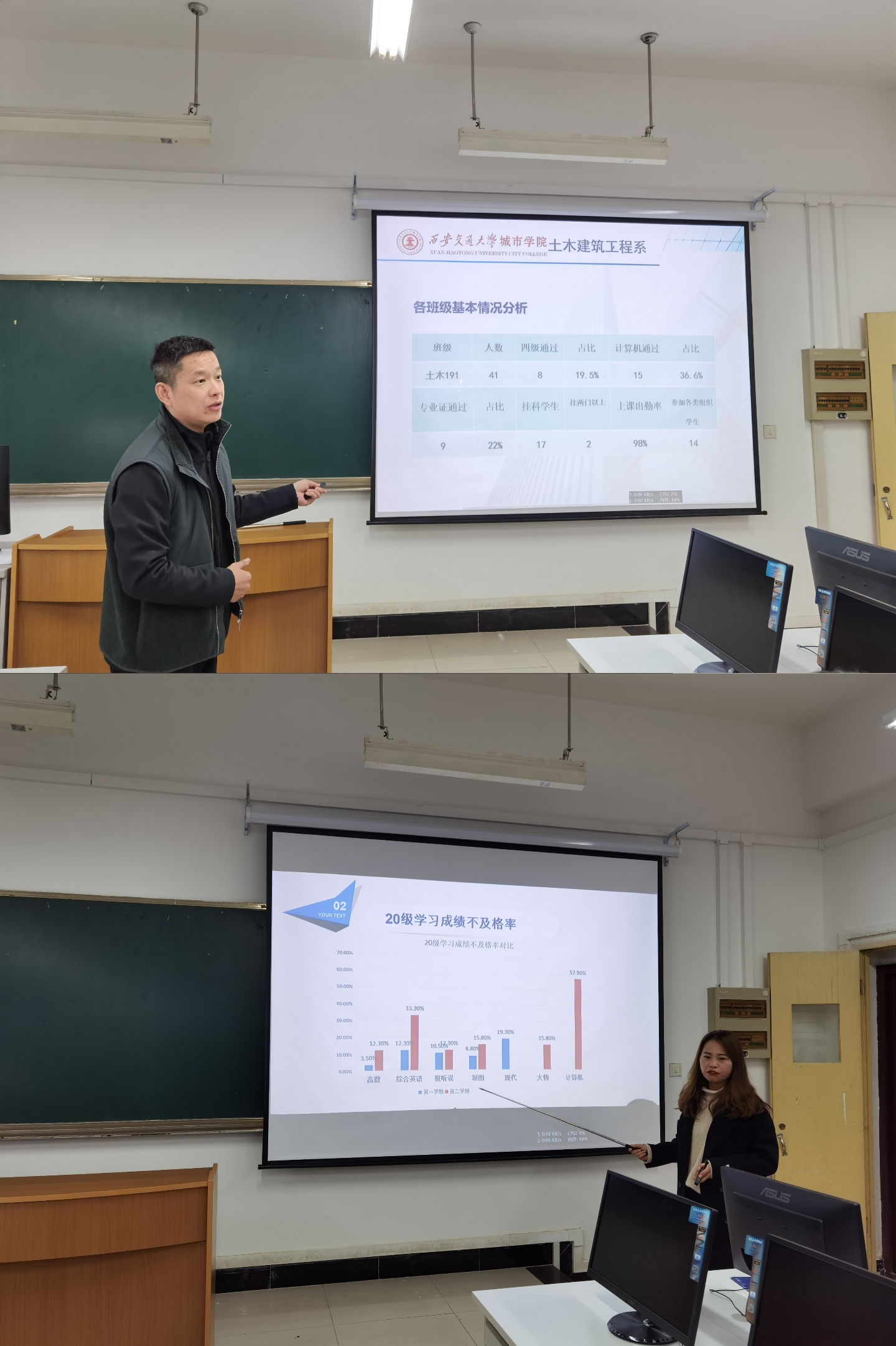 最后系主任廖红建教授对今天各位老师的汇报情况进行点评,充分肯定大家在学生工作中所做的努力,通过PPT汇报可以使大家对所带班级情况有一个更加清晰的分析,有利于各位老师进行班级管理,有助于提高学生成绩,促进土建系教学与学风建设。希望各位老师在今后的工作中再接再厉,创新工作方法,提高工作效果。