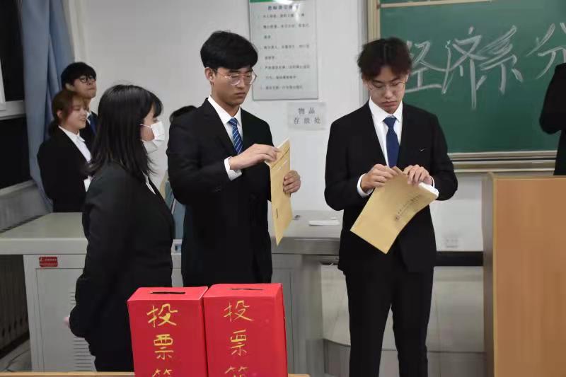 本次大会在慷慨激昂的国歌奏唱中拉开帷幕,采用公开、无记名投票选举方法,首先由徐睿进行宣读,并经候选人代表审议通过选举方法,其次全体候选人审议通过监票人于鑫涛、总监票人蒋世光、计票人常宇浩、总计票人徐睿的建议名单;在工作人员的有序组织下,全体候选人就正式代表进行投票,选举产生正式代表22人,其中团员代表8人、双代会代表5人及学代会代表9人,期间,蒋美一帆向大家宣读《会议工作报告》,对团学工作进行汇报总结,对存在的实际问题进行分析,尤其是对今后团学组织工作的提出符合实际、目标明确的改进措施。在顺利完成会议的各项流程和任务后,经济系团员代表会议和学生代表会议伴随着共青团团歌的歌声落下帷幕。