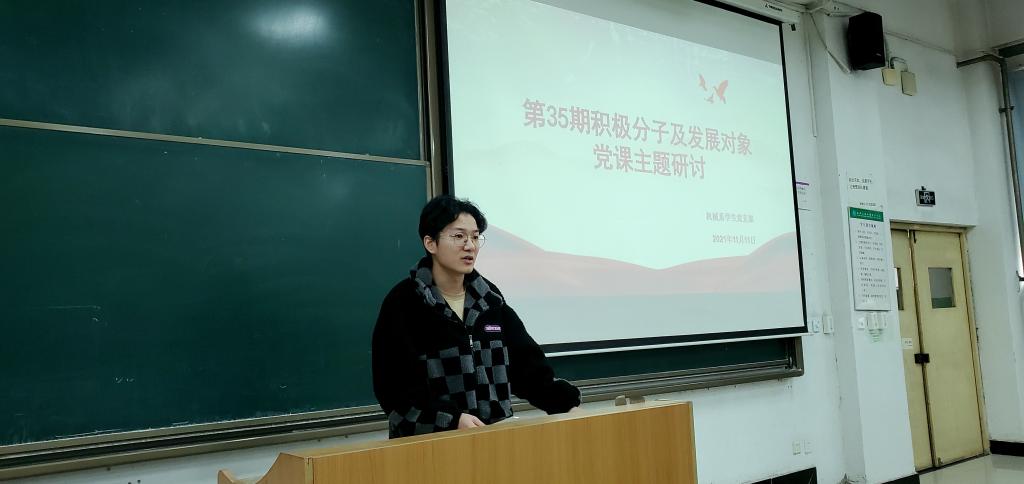 各位积极分子及发展对象结合党课培训班学习的理论知识以及学习强国上网络学习内容以分小组的方式进行了分享交流,涉及到习近平新时代中国特色社会主义思想三十讲、以建党百年谈青年干部的成长、十九大党章公开课等多项学习内容。其中发展对象代表丁松浩同学、刘浩楠同学、王凯同学将自己的理论学习与自身的角色相结合作了分享,勉励在场的各位同学明确自身历史使命,勇担重任,刻苦学习,掌握知识,提升本领,努力成长为能担当民族复兴大任的时代新人。他们的分享赢得了在场同学的阵阵掌声。