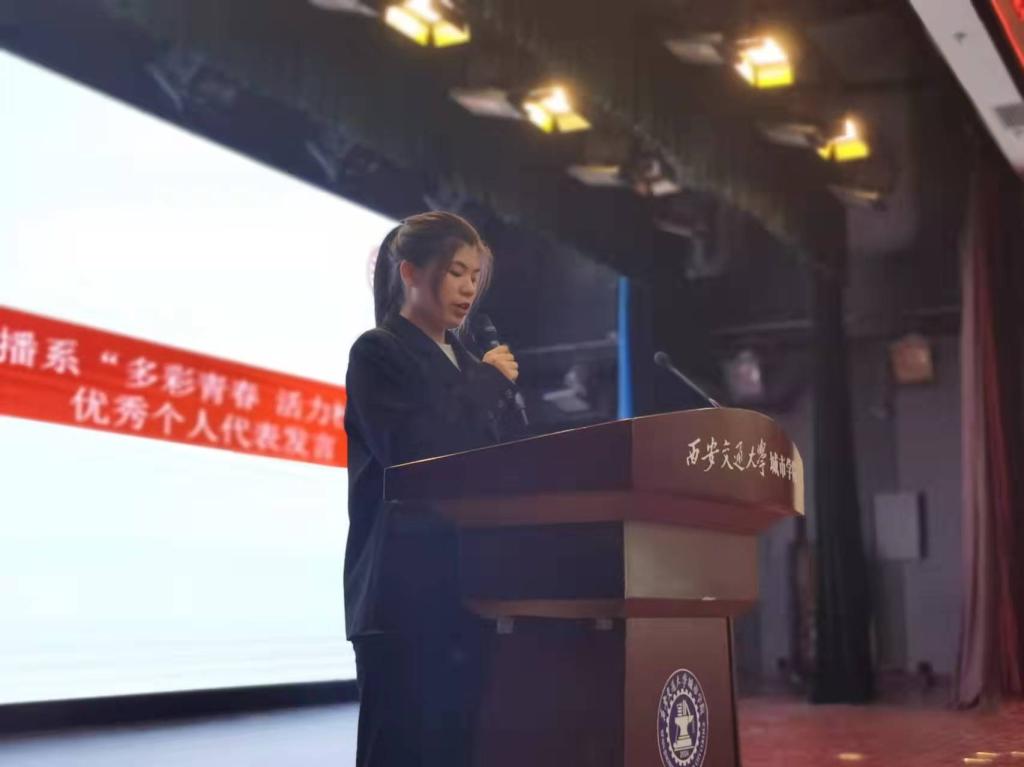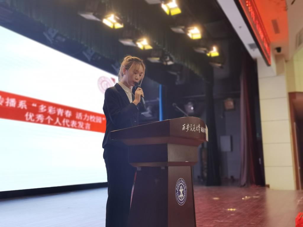 来自网媒193班的王凡同学和播主2001班的梁馨元同学作为优秀个人代表上台发言,她们分享了自己参与活动的经验和感受,表示通过本次活动,可以进一步发挥自身特长,为自己的大学生活增添色彩。针对此次活动,她们对同学们提出了许多期许和建议,引起了同学们的强烈反响。2021级新生代表刘轩辕同学上台发言,她对本次“多彩青春,活力校园”活动做了充分展望,她希望全体新生能够以饱满的热情投入到本次活动中去,用激情去创造,用行动去证明,让我们的校园飘荡着青春的活力。