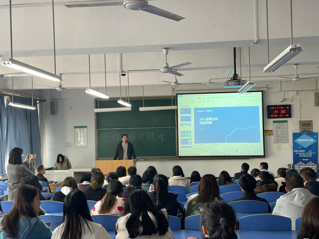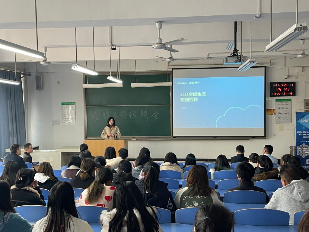 交流会一开始,金蝶公司负责人首先介绍了金蝶的历史、公司概况、业务覆盖范围、金蝶服务理念、金蝶与高校联合办学情况、金蝶招聘条件以及培训目标。立邦公司负责人作为金蝶的合作企业,也在现场向在座的同学们做出了详细的招聘宣传。随后两家公司的人员又针对与高校合作办学的事项进行了详细讲解,使同学们对校企共同合作有了进一步了解。在座的各位同学也就相关疑问与两家公司人员进行了交流,公司人员对他们的问题进行了认真的解答。在招聘会的最后,现场还进行了一次笔试和面试,同学们都对此次招聘会非常满意。招聘会在轻松的氛围中圆满结束。