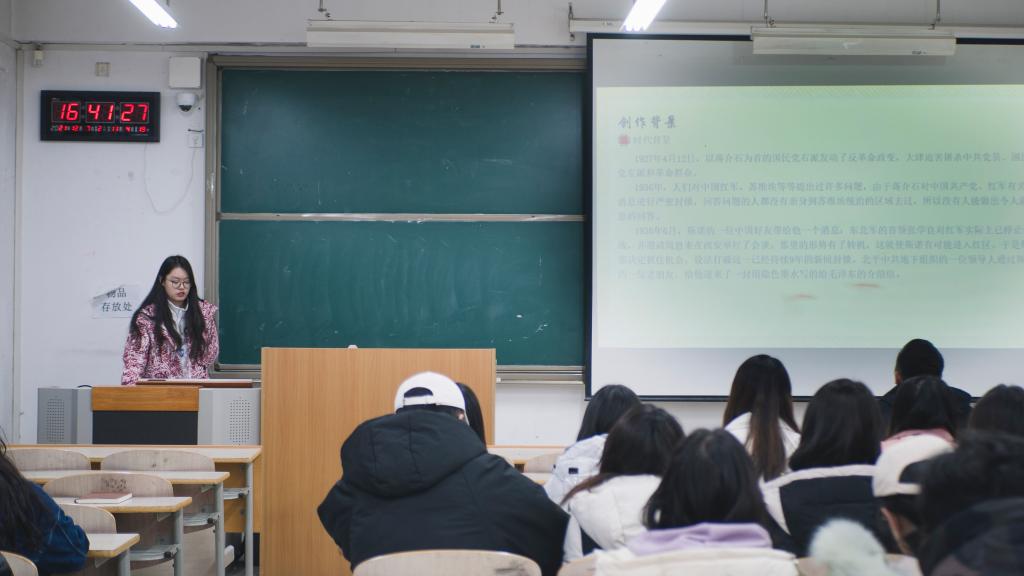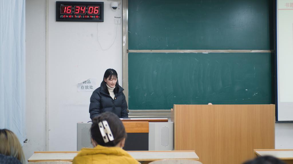 学生党员周昊就《红色家书》这一作品进行读书分享。她向我们讲述了在那个艰苦的战争年代,作为地下革命工作者写一封家书报平安是多么的不易。通过这一封封家书,她表示和平年代来之不易,希望新时代的学生党员能够忆苦思甜,珍惜当下。