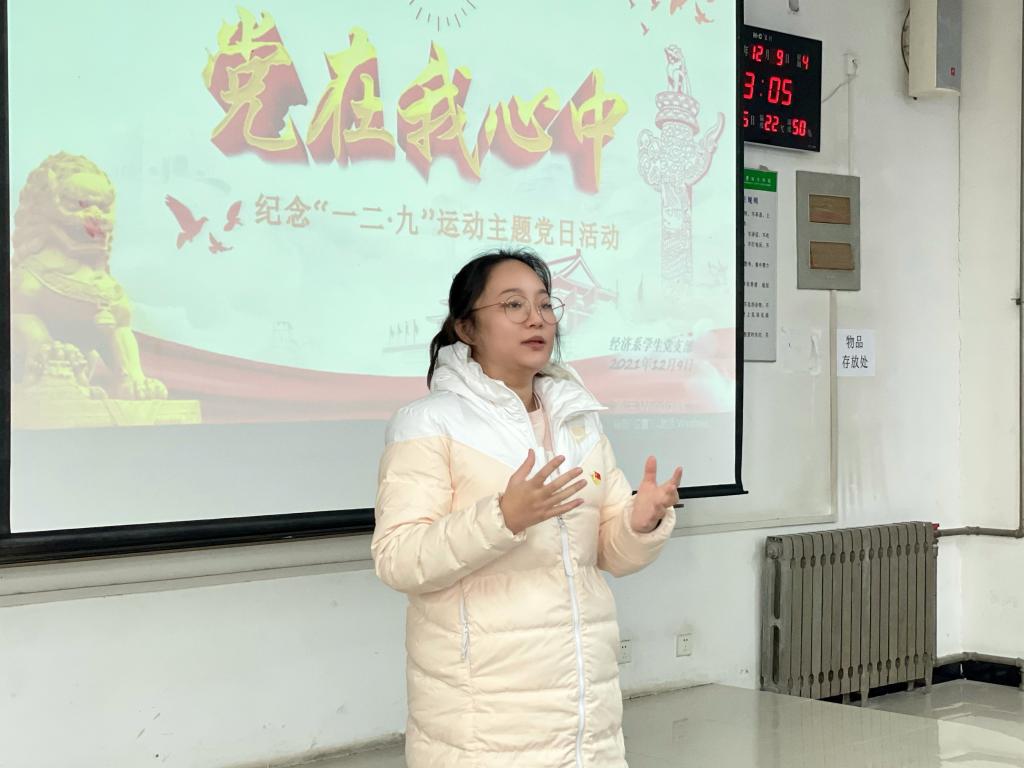 经济系学生党支部书记廉宇婷发表总结讲话。她指出通过党支部举行纪念“一二•九”爱国主题党日活动,希望党员同志们以史为鉴,坚定理想信念,传承红色基因,牢记初心使命,刻苦学习科学文化知识,以此增长才干及本领,成为中国特色社会主义事业的建设者和接班人。并对本次主题党日活动举办过程中的优点给予肯定,同时也明确指出了每一名党员存在的不足,鼓励同学们不忘初心、牢记使命、砥砺前行,为民族复兴、国家强盛、学校发展贡献出自己的力量。