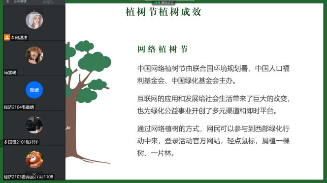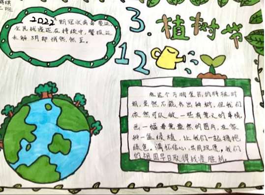 活动开展期间,以聚焦“3·9保护母亲河日”“3·12植树节”“3·21世界森林日”等时间节点,开展植绿护绿示范系列活动。通过微信、支付宝、小程序等线上平台举办绿植领养等相关绿色实践活动,宣传公众植树义务,普及生态文明理念。经济系学生党支部、千阳志愿服务队组织动员广大同学积极创作植树护绿、垃圾分类有关手抄报,在活动中贯彻绿色低碳理念,并开展线上宣讲、调查问卷等活动,以此提高同学们爱护植物和保护环境的意识。