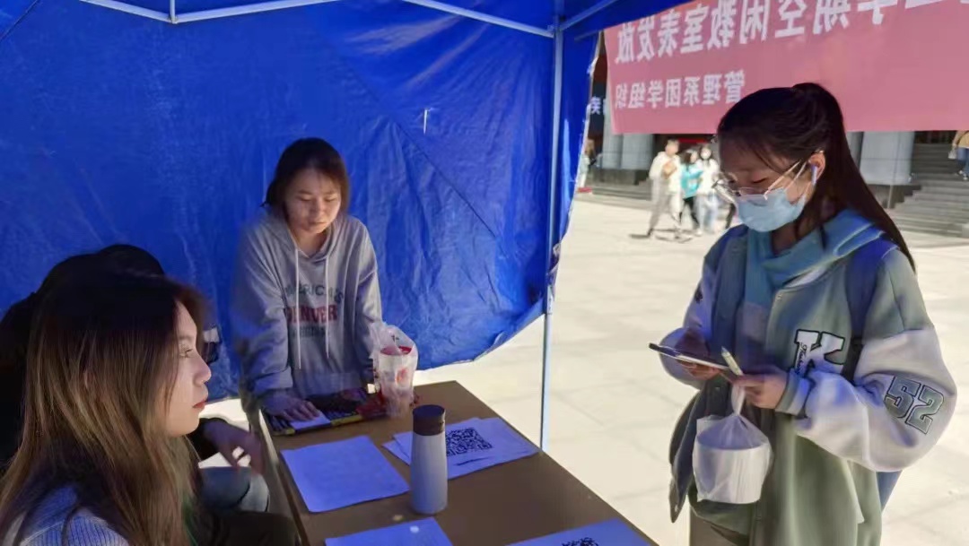 活动期间,办公室工作人员在中快楼下发放空闲教室表,并且积极向同学们讲解表中内容。同时帐篷下还会有工作人员值班,提供二维码,以便同学们将电子版空闲教室表存入手机以备查找。