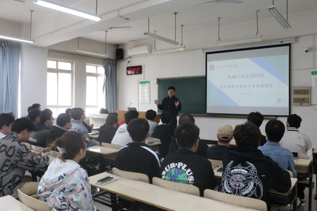 为切实做好2019级学生实习工作,深挖就业岗位,积极与用人单位构建岗位供需平台,为汽车产业输送技术技能型人才,威尼斯7798cc机械工程系于4月22日上午在教学楼b316召开2019级吉利班实习动员及专场招聘会。由机械工程系特邀吉利汽车集团有限公司校企合作经理王凯进行宣讲。