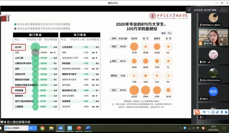 为促进管理类全体新生对管理系专业的进一步认识和了解,明晰个人专业发展规划与方向。自9月3日至9月6日,会计学专业、财务管理专业、工商管理专业、人力资源管理专业、市场营销专业分别在腾讯会议上进行了专业认知教育会议。