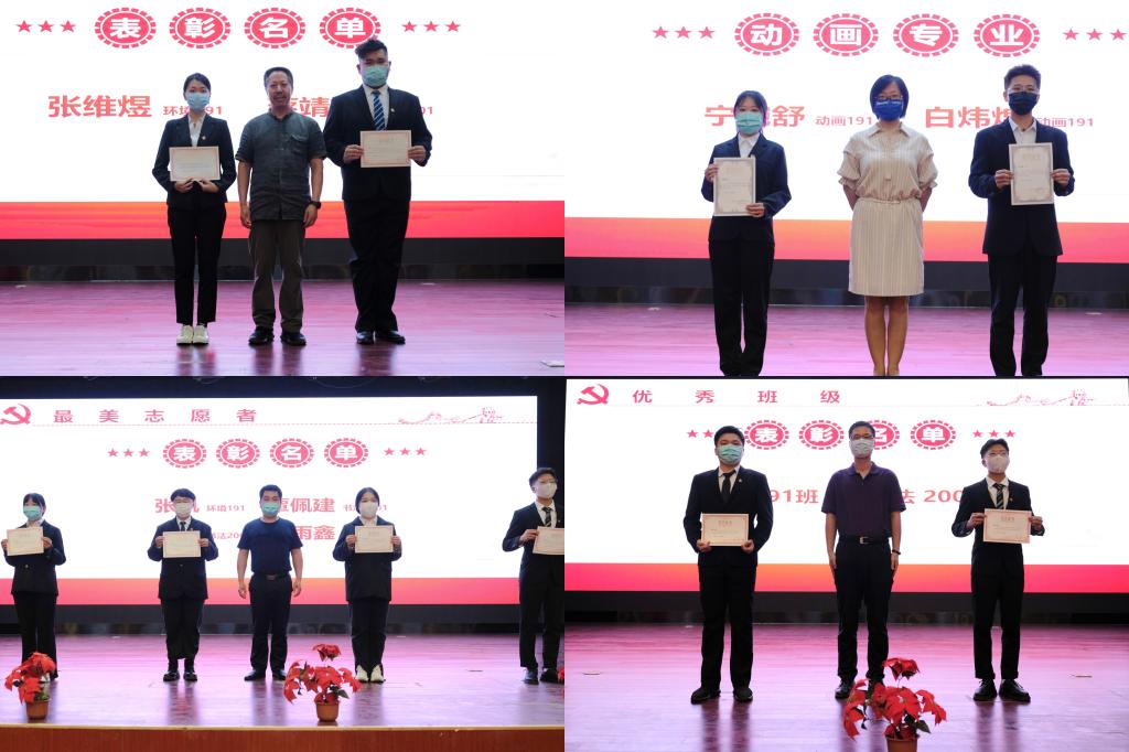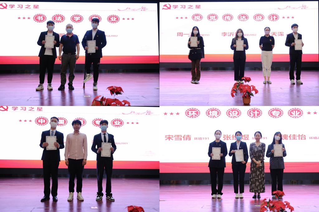 其次,在颁奖环节,对上一学年在各专业表现突出的专业学习之星、优秀宿舍、优秀班级、最美志愿者、竞赛达人进行表彰。过去一年的第一课堂和第二课堂中,艺术系学子共获国家级和省级奖项50余人次,在学业之外,也完成各项志愿服务,较好地展现了艺术学子的感恩、担当、上进、精业的状态。此次表彰既是对高年级同学的肯定,也是对新同学的期待。