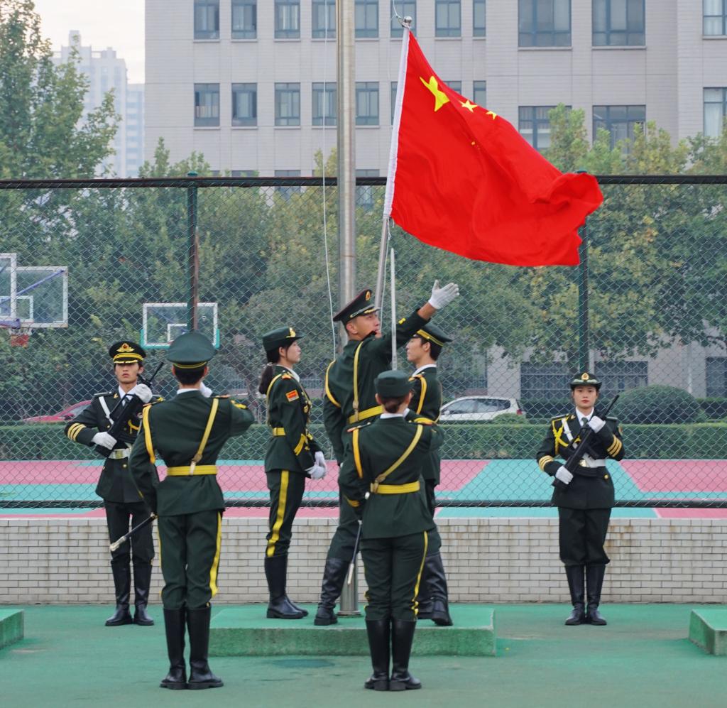 上午7时,学院国旗护卫队全体队员迎着朝阳,踏着矫健步伐,庄重地护卫着国旗进场。当庄严雄壮的《义勇军进行曲》奏响时,擎旗手振臂一扬,鲜艳的五星红旗冉冉升起,在微风中猎猎飘扬。全体师生庄严肃立,向国旗行注目礼,共唱国歌。