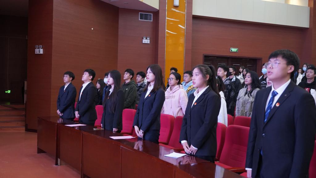 在团学干部表彰环节中,任瑾宣读2021届优秀团学干部名单,杨耀聪为受表彰的团学干部颁发荣誉证书,解文杰同学作为优秀团学干部代表进行发言。在新任团学干部受聘仪式环节中,杨耀聪宣读2022届团学干部任命名单,吴越为新任团学干部颁发聘书。林芷羽同学、席庭薇同学作为新一届团学干部代表分别进行发言。